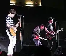 Fall Out Boy in concert in 2006. From left to right: Joe Trohman, Pete Wentz, Patrick Stump.