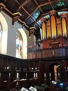 Viewed from the main entrance to Peterhouse on Trumpington Street, the altar end of the Chapel is the most immediately visible building. The Chapel was built in 1628 when the Master of the time Matthew Wren (Christopher Wren's uncle) demolished the college's original hostels. Previously the college had employed the adjacent Church of St Mary the Less as its chapel. The Chapel was consecrated on 17 March 1632 by Dr Francis White, Bishop of Ely.[7] The building's style reflects the contemporary religious trend towards Arminianism. The Laudian Gothic style of the Chapel mixes Renaissance details but incorporated them into a traditional Gothic building. The Chapel's Renaissance architecture contains a Pietà altarpiece and a striking ceiling of golden suns. Its placement in the centre of one side of a court, between open colonnades is unusual, being copied for a single other college (Emmanuel) by Christopher Wren.[26] The original stained glass was destroyed by Parliamentarians in 1643, with only the east window's crucifixion scene (based on Rubens's Le Coup de Lance) surviving.[nb 1] The current side windows are by Max Ainmiller, and were added in 1855. The cloisters on each side of the Chapel date from the 17th century. Their design was classicised in 1709, while an ornamental porch was removed in 1755. The Peterhouse Partbooks, music manuscripts from the early years of the Chapel, survive, and are one of the most important collections of Tudor and Jacobean church music. The Chapel Choir, one of the smallest in Cambridge, has recently attracted wider interest for its regular performances of this material, some of which has not been heard since the 16th century. The restoration of the 1763 John Snetzler organ in the Chapel was by Noel Mander.