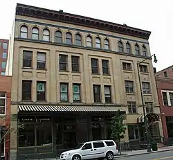It is a four- and five-story building with a post and beam structural system and with facing of beige brick. It has a pressed metal cornice and a flat roof. The original part, built in 1899, is four stories, and fills two lots. A 1915 addition on a third lot on the north side has five stories but is the same height, and is tied in by the cornice and by windows having the same design. The construction of both parts was designed and/or supervised by architects Gove and Walsh.[2]