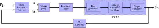 The block diagram shown in the figure shows an input signal, FI, which is used to generate an output, FO. The input signal is often called the reference signal (also abbreviated FREF).[17]