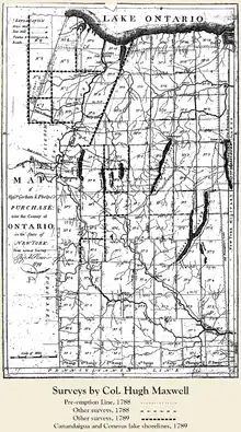 The Fort Stanwix Treaty and earlier treaties established the approximate western boundary, but a survey was required to establish the exact line.[6] Phelps believed that the line ran through Seneca Lake and included the former Cayuga settlement of Kandesaga, present-day Geneva, New York. He planned to make Geneva the headquarters and location of the land sales office. He hired Col. Hugh Maxwell, a man of high reputation, to perform the survey. During his original survey for Phelps and Gorham, Maxwell was assisted by Augustus Porter and other surveyors.[8]