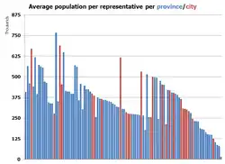 Eighty percent of representatives shall come from congressional districts, with each district returning one representative. The constitution mandates that every province and every city with a population of 250,000 must have at least one representative. Each legislative district, regardless of population, has one congressman. For provinces that have more than one legislative district, the provincial districts are identical to the corresponding legislative district, with the exclusion of cities that do not vote for provincial officials. If cities are divided into multiple districts for city hall representation purposes, these are also used for congressional representation.