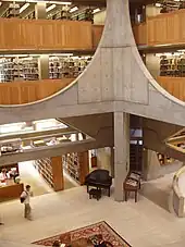 A circular double staircase built from concrete and faced with travertine greets the visitor upon entry into the library. At the top of the stairs the visitor enters a dramatic central hall with enormous circular openings that reveal several floors of book stacks. At the top of the atrium, two massive concrete cross beams diffuse the light entering from the clerestory windows.
