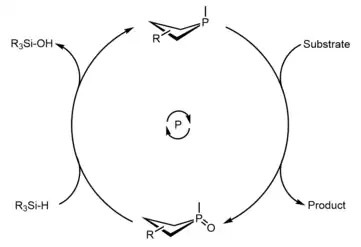 Since the early 2010s, much progress has been made in the development of phosphetanes as useful reagents and catalysts to complement transition metal catalysts in organic synthesis. These efforts have primarily been made by the research group of Dr. Alexander Radosevich[43][44][45][46][47][48] at Pennsylvania State University, and subsequently the Massachusetts Institute of Technology, but contributions from the lab of Dr. Thomas Werner[49][50] at the Leibniz-Institut für Katalyse (Leibniz Institute for Catalysis) have also been impactful. The common theme underpinning these works is an active phosphetane species reductively acting on a substrate, resulting in formation of phosphetane oxide and the desired product, followed by reduction of the phosphetane oxide back to the phosphetane with a mild silicon hydride which closes the catalytic cycle.