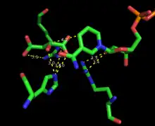 Active site of human PHGDH. Key residues (two Arg and one His) and substrates shown. The 4.2 Å distance is between the carbons undergoing hydride transfer. From 2G76 rendering of PHGDH crystallized with NAD+ and D-malate.
