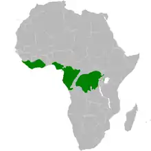 The icterine greenbul is found in Africa from Guinea to Ghana; southern Nigeria to western and southern Uganda, eastern and central Democratic Republic of the Congo and extreme north-western Angola.[7] Its natural habitats are subtropical or tropical dry forests, subtropical or tropical moist lowland forests, and moist savanna.