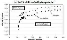 An example is shown in the figure on the right with a water jet.[3] The laminar two-dimensional jet amplifies small disturbances at the orifice to generate a vortex street. For this case, the flow speed, in terms of Reynolds number, was graphed against the disturbance frequency, in terms of the Strouhal number for a variety of disturbance amplitudes to reveal the region of instability as shown in the figure on the left. The value of D in the figure represents the ratio of the lateral disturbance displacement to the nozzle width; the disturbances were minute.