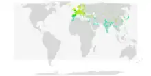 This species breeds throughout Eurasia up to latitudes 75°N, only being absent in the Arctic from areas where the July isotherm is less than 4 °C. It also breeds in the mountains of Morocco and western Alaska. It occupies a wide range of habitats, but is absent from deserts.[20] White wagtails are residents in the milder parts of its range such as western Europe and the Mediterranean, but migratory in much of the rest of its range. Northern European breeders winter around the Mediterranean and in tropical and subtropical Africa,[27] and Asiatic birds move to the Middle East, India,[22] and Southeast Asia.[28] Birds from the North American population also winter in tropical Asia.[29]