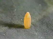 The small white will readily lay eggs on both cultivated and wild members of the cabbage family, such as charlock (Sinapis arvensis) and hedge mustard (Sisymbrium officinale). P. rapae is known to lay eggs singularly on the host plant. The egg is characterized by a yellowish color and 12 longitudinal ridges.[13] The egg production peaks about a week after adulthood in lab and the female can live up to 3 weeks. Females tend to lay fewer eggs on plants in clumps than on isolated plants.[8][14] It has been suggested that isothiocyanate compounds in the family Brassicaceae may have been evolved to reduce herbivory by caterpillars of the small white.[15] However, this suggestion is not generally accepted because the small white has later been shown to be immune to the isothiocyanate forming reaction due to a specific biochemical adaptation. In contrast, the small white and relatives seem to have evolved as a consequence of this biochemical adaptation to the isothiocyanate-forming glucosinolates.