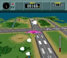A flight simulator game resembling Pilotwings called Dragonfly was shown during the official unveiling of the SNES to the Japanese press on November 21, 1988.[18][19] The game was used to demonstrate the system's Mode 7 graphics system, which allows rotation, scaling, and other effects to be used on flat images to create a 3D effect.[20] Because the game does not use the coprocessor chip Super FX, the true Super NES 3D technology, the buildings, runway, trees, and so on are all "painted" flat on the ground plane, and they appear to stick out of the ground when the player's viewpoint is far above.[21][22]