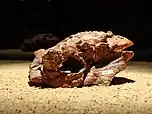 The American Museum of Natural History sponsored several Central Asiatic Expeditions to the Gobi Desert in Mongolia in the 1920s. Among the many paleontological finds from the "Flaming Cliffs" of the Djadokhta Formation in Shabarakh Usu (Bayn Dzak) were the original specimens of Pinacosaurus, found by Walter W. Granger in 1923. In 1933, Charles Whitney Gilmore named and described the type species Pinacosaurus grangeri. The generic name is derived from Greek πίναξ, pinax, "plank", in reference to the small rectangular scutes covering the head. The specific name honours Granger, who accompanied the 1923 expedition as a paleontologist. The holotype, AMNH 6523, was found in a layer of the Djadokhta Formation, dating from the Campanian. It consists of a partially crushed skull, lower jaws, the first two neck vertebrae, and dermal bones collected in 1923. The skull is still the largest known of the genus.[2][3]