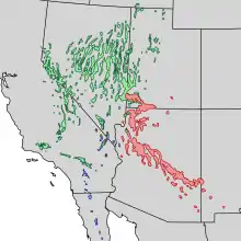 | Natural range: green – Pinus monophylla subsp. monophylla blue – Pinus monophylla subsp. californiarum red – Pinus monophylla subsp. fallax | |