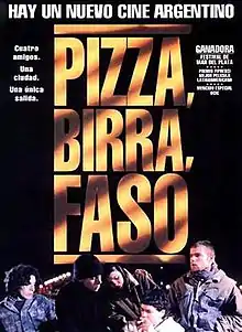 Pizza, Beer, and Cigarettes (Spanish: Pizza, birra, faso; also known as Pizza, Beer & Smokes) is a 1998 Argentine crime drama film written and directed by Israel Adrián Caetano and Bruno Stagnaro and starring Héctor Anglada, Jorge Sesan and Pamela Jordán. The film tells the story of a gang of marginalized adolescents who survive on the streets of Buenos Aires carrying out low-level robberies. Pizza, Beer, and Cigarettes is the film that's known as "the spark that ignited the New Argentine Cinema when it premiered at the international Mar del Plata Film Festival."[2] It was filmed entirely in Buenos Aires.