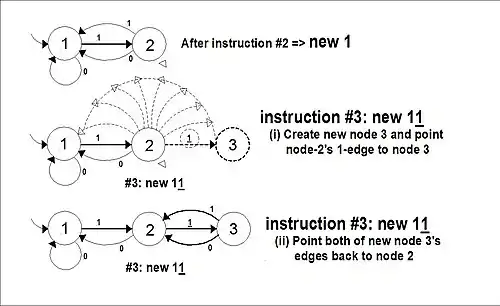 (1) new w instruction, which creates a new node at the end of the path w, with all its edges directed to the next-to-last node in w. (2) set w to v instruction which (re)directs an edge to a different node. Here w and v represent words. The instruction results in changing the destination of the last edge in the path w.
