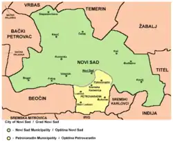 Municipality of Novi Sad includes: Novi Sad proper, Futog, Veternik, Begeč, Budisava, Kać, Kovilj, Kisač, Rumenka, Stepanovićevo, and Čenej. Municipality of Petrovaradin includes: Petrovaradin town, Sremska Kamenica, Bukovac, Ledinci, and Stari Ledinci. Geographically, the municipality of Novi Sad is located in Bačka, while municipality of Petrovaradin is located in Syrmia.