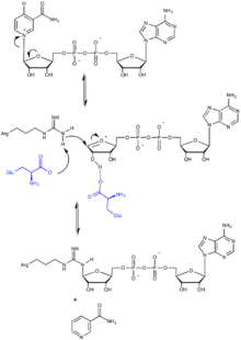 Mono(ADP-ribosyl)transferases commonly catalyze the addition of ADP-ribose to arginine side chains using a highly conserved R-S-EXE motif of the enzyme.[13] The reaction proceeds by breaking the bond between nicotinamide and ribose to form an oxonium ion. Next, the arginine side chain of the target protein then acts a nucleophile, attacking the electrophilic carbon adjacent to the oxonium ion. In order for this step to occur, the arginine nucleophile is deprotonated by a glutamate residue on the catalyzing enzyme. Another conserved glutamate residue forms a hydrogen bond with one of the hydroxyl groups on the ribose chain to further facilitate this nucleophilic attack. As a result of the cleavage reaction, nicotinamide is released. The modification can be reversed by (ADP-ribosyl)hydrolases, which cleave the N-glycosidic bond between arginine and ribose to release ADP-ribose and unmodified protein; NAD+ is not restored by the reverse reaction.