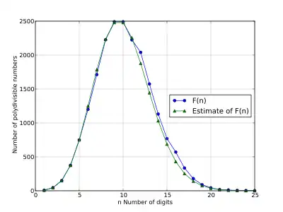 | Length n | F2(n) | Est. of F2(n) | Polydivisible numbers |