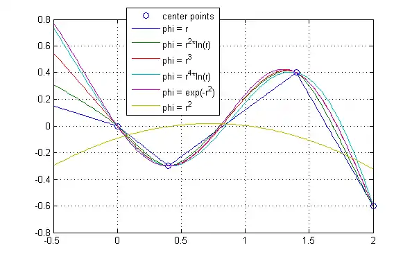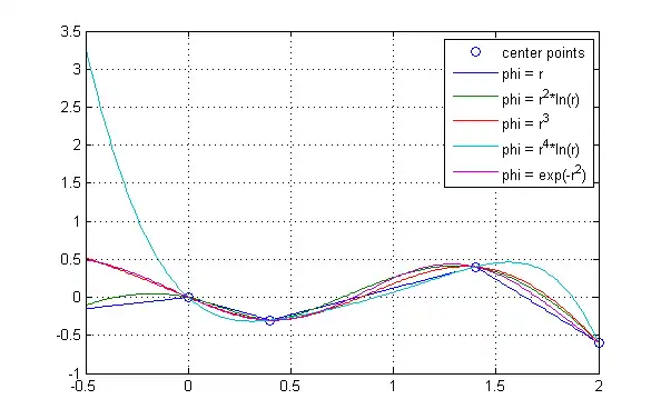 The next figure shows the interpolation through four points (marked by "circles") using different types of polyharmonic splines. The "curvature" of the interpolated curves grows with the order of the spline and the extrapolation at the left boundary (x < 0) is reasonable. The figure also includes the radial basis functions φ = exp(−r2) which gives a good interpolation as well. Finally, the figure includes also the non-polyharmonic spline phi = r2 to demonstrate, that this radial basis function is not able to pass through the predefined points (the linear equation has no solution and is solved in a least squares sense).
