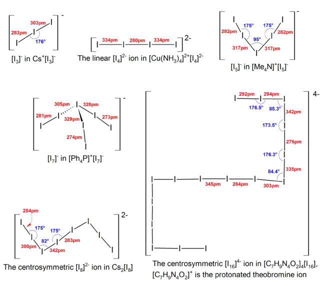 units. Discrete polyiodides are usually linear. The more complex two- or three-dimensional network structures of chains and cages are formed as the ions interact with each other, with their shapes depending on their associated cations quite strongly, a phenomenon named dimensional caging.[4][5] The table below lists the polyiodide salts which have been structurally characterized, along with their counter-cation.[6]