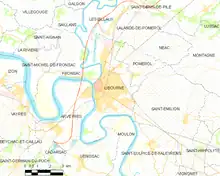 Pomerol lies immediately to the east and north-east of Libourne. Unlike most of the most prestigious communes of Bordeaux, it has no direct river access, being separated from the Dordogne to the south by the town and by Saint-Émilion, which lies to the south-east. To the north-east, across a stream called la Barbanne Rau lies Lalande-de-Pomerol. It stands on a gravel bank (a feature it shares with the prestigious appellations of the Médoc); towards the south and west, the soil is more sandy, while towards the north and east, it tends to clay. The sub-soil is dark packed clay, with a high iron content.[4][5] The terrain is relatively flat with slight undulating slopes that fall from a height of 35-40 meters (115–130 feet) above sea level over a course of 2 kilometers (1.2 miles) to around 10 meters (33 feet).[11]