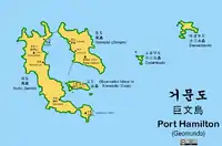 Komundo or Port Hamilton, officially Geomun-do (Korean: 거문도; Hanja: 巨文島/巨門島; RR: Geomun-do), is a small group of islands in the Jeju Strait off the southern coast of the Korean Peninsula, located approximately at 34°1′35″N 127°18′45″E / 34.02639°N 127.31250°E / 34.02639; 127.31250. The islands are 12 km2 (4.6 sq mi). There are three principal islands, the two larger ones, Sodo to the west (Seo-do, 서도, 西島) and Sunhodo to the east (Dong-do, 동도, 東島) forming a harbor with the smaller island in the center. On this central island, Observatory Island (or Go-do, 고도, 古島), there was a British naval base from 1885 to 1887.