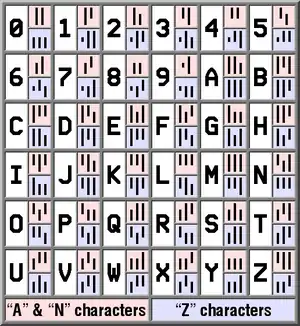 Z characters use the full 36 combinations representable by 3 bars. The values 0–25 encode the letters A–Z, and 26–35 encode the digits 0–9.