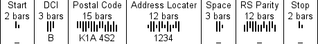 On the other hand, PostBar format D52.01, as described in and shown here, encodes the Postal Code using only twelve bars and an unknown symbology. It encodes nine alphanumerics in the Address Locater field using twenty one bars and another unknown symbology. It does not include any fields for space characters, but it does include twelve bars for Reed-Solomon error correction for a total count of fifty two bars.