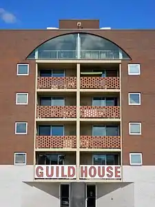 In place of the functional doctrines of modernism, Venturi proposed giving primary emphasis to the façade, incorporating historical elements, a subtle use of unusual materials and historical allusions, and the use of fragmentation and modulations to make the building interesting.[4] Accomplished architect and urban planner Denise Scott Brown, who was Venturi's wife, and Venturi wrote Learning from Las Vegas (1972), co-authored with Steven Izenour, in which they further developed their joint argument against modernism. They urged architects to take into consideration and to celebrate the existing architecture in a place, rather than to try to impose a visionary utopia from their own fantasies. This was in line with Scott Brown's belief that buildings should be built for people, and that architecture should listen to them. Scott Brown and Venturi argued that ornamental and decorative elements "accommodate existing needs for variety and communication". The book was instrumental in opening readers' eyes to new ways of thinking about buildings, as it drew from the entire history of architecture—both high-style and vernacular, both historic and modern—and In response to Mies van der Rohe's famous maxim "Less is more", Venturi responded, to "Less is a bore." Venturi cited the examples of his wife's and his own buildings, Guild House, in Philadelphia, as examples of a new style that welcomed variety and historical references, without returning to academic revival of old styles.[5]