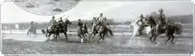 In 1902, The Courier-Journal of Louisville, Kentucky described a mounted potato race that took place at the Louisville Horse Show, remarking on its violence and noting that it "made a big hit."[11] It was not until 1912 that newspapers reported potato racing as a mounted rodeo event, with advertisements for one large Los Angeles rodeo listing the potato race by name, although without elaboration on the rules.[12] A 1913 report in the San Francisco Chronicle clearly describes a team-based potato race taking place at a Mardi Gras celebration in Salinas, California, calling it a "new riding stunt".[13]