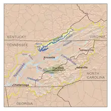 - ↑ Obtained from adding the length of the Tennessee section of the river, indicated as 115.5 miles on USGS topographical maps, to the Virginia section of the river, indicated as 80 miles on the Virginia Department of Game and Inland Fisheries website.