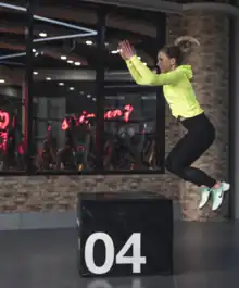 A box jump being performed in a gym. Plyometrics are a basic and effective power training exercise which require little or no equipment. Jumping with the addition of weights, such as dumbbells or a trap bar, can lead to an even greater ability to perform powerfully.