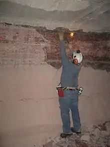 A worker samples potash minerals at a mine in Saskatchewan. Note the thin interbeds of grey claystone.