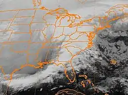 An infrared satellite image of the storm during its most significant impact, taken just after midnight on December 23, 2004