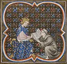Primat's Old French chronicle, Roman des rois ("Romance of Kings"), was presented to Philip III in about 1274. It was probably commissioned by the king's father, Louis IX.[8] Primat's abbot, Matthew of Vendôme, also had a large role in its production and is a more imposing figure than the king in the original presentation miniature.[9] It was created by translating and adapting excerpts from various Latin histories in the archives of Saint-Denis.[8]