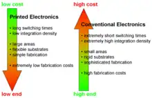 The most important benefit of printing is low-cost volume fabrication. The lower cost enables use in more applications.[8] An example is RFID-systems, which enable contactless identification in trade and transport. In some domains, such as light-emitting diodes printing does not impact performance.[6] Printing on flexible substrates allows electronics to be placed on curved surfaces, for example: printing solar cells on vehicle roofs. More typically, conventional semiconductors justify their much higher costs by providing much higher performance.