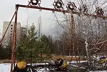 The Pripyat amusement park is an abandoned amusement park located in Pripyat, Ukraine. It was to have its grand opening on 1 May 1986, in time for the May Day celebrations,[1][2] but these plans were cancelled on 26 April, when the Chernobyl disaster occurred a few kilometers away. Several sources report that the park was opened for a short time on 27 April before the announcement to evacuate the city was made.[3][4][5] These reports claim that the park was hurriedly opened to distract Pripyat residents from the unfolding disaster nearby. However, these claims remain largely unsubstantiated and unsupported. Pripyat residents have not been able to recall for sure if the park was opened following the disaster, but considering the lack of panic at the time of the disaster and subsequent evacuation, there would seem to be no need to distract people.[6] In any case, the park—and its ferris wheel in particular—have become a symbol of the Chernobyl disaster.[7]