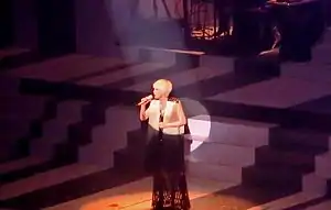 Chan's 10-night concert residency, "Priscilla Chan in Concert '96" (雪映美白'96陳慧嫻演唱會) held in 1996 during the Lunar New Year period at the Hong Kong Coliseum reaffirmed her popularity with the public.[69] Chan also released a well-received greatest hits album with new releases including the theme song for the concert, "Contented" (心滿意足).[70] In the second half of 1996, Chan released another album "Problematic Woman" (問題女人) with the title track "Problematic Woman", seeking a change in image and musical style, but with generally negative responses.[71] Chan also filmed a special music programme series titled "Wonderful Encounters in England" (英倫奇緣) in the UK for TVB as promotion.[72] Nevertheless, tracks like "Wonderful Journey" (奇妙旅程) and "End of Fate" (緣了,就是完) still achieved considerable results and the former was awarded the 1996 Jade Solid Gold Best Ten Music Awards.[73]