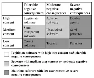The work by Warkentiens et al. (described in Section 7.3.1 in (Boldt 2007a)) can be used as a starting point when developing a classification of privacy-invasive software, where we classify privacy-invasive software as a combination between user consent and direct negative consequences. User consent is specified as either low, medium or high, while the degree of direct negative consequences span between tolerable, moderate, and severe. This classification allows us to first make a distinction between legitimate software and spyware, and secondly between spyware and malicious software. All software that has a low user consent, or which impairs severe direct negative consequences should be regarded as malware. While, on the other hand, any software that has high user consent, and which results in tolerable direct negative consequences should be regarded as legitimate software. By this follows that spyware constitutes the remaining group of software, i.e. those that have medium user consent, or which impair moderate direct negative consequences. This classification is described in further detail in Chapter 7 in (Boldt 2007a).