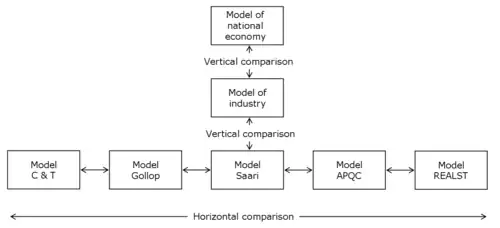 The principle of model comparison becomes evident in the figure. There are two dimensions in the comparison. Horizontal model comparison refers to a comparison between business models. Vertical model comparison refers to a comparison between economic levels of activity or between the levels of business, industry and national economy.