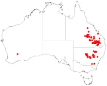 Gaping mint-bush grows on rocky sandstone ridges, on stony hills and in forest on the western slopes and plains of New South Wales north from near Mendooran and in eastern central Queensland, including in the Darling Downs, Maranoa and Mitchell districts.[2][3]