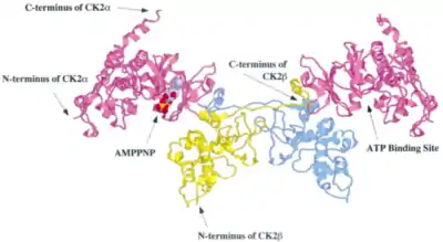 - 1 2 3 4 5 6 Litchfield DW (January 2003). "Protein kinase CK2: structure, regulation and role in cellular decisions of life and death". The Biochemical Journal. 369 (Pt 1): 1–15. doi:10.1042/BJ20021469. PMC 1223072. PMID 12396231.