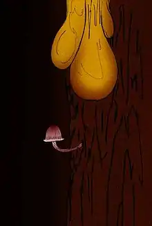 The holotype of Protomycena is a single fruit body without any associated structures, preserved in a piece of clear light yellow polished amber approximately 4.5–2.5 cm (1.77–0.98 in) wide. The pileus is 5 mm (0.2 in) in diameter and has a convex shape, sporting a raised central region (an umbo). The pale flesh appears yellowish in the amber, and is smooth and glossy, changing to striate and slightly translucent towards the margin. The pileus margin is striated and slightly flared. The gills on the underside of the pileus are broadly attached (adnate) to the top of the stipe, and distantly spaced—between six and eight gills extend completely from the pileus margin to the stipe. These full-length gills are anastomosed with lamellulae (short gills which do not reach the edge of the stipe from the pileus margin) of varying lengths.[2] The pileus is centered on the curved stipe, which is smooth and cylindrical, measuring 0.75 mm (0.030 in) thick by 10 mm (0.39 in) long. The stipe lacks a ring and rhizoids. The mushroom is preserved with a small liquid and gas-filled bubble, possibly originating from the mushroom itself, which indicates the amber to be very solid and well-sealed.[1]
