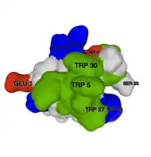 Protoxin-I is a peptide possessing a 35 amino acid sequence of Glu-Cys-Arg-Tyr-Trp-Leu-Gly-Gly-Cys-Ser-Ala-Gly-Gln-Thr-Cys-Cys-Lys-His-Leu-Val-Cys-Ser-Arg-Arg-His-Gly-Trp-Cys-Val-Trp-Asp-Gly-Thr-Phe-Ser (see Table 1 for one-letter sequence) with 3 disulphide bonds between Cys2-Cys16, Cys9-Cys21 and Cys15-Cys28.[7] Nuclear Magnetic Resonance Spectroscopy of Protoxin-I revealed two beta strands in the protein structure.[5] Gating-modifier toxins isolated from spider venom all share a conserved molecular structure consisting of a hydrophobic patch, populated by hydrophobic residues, and surrounded by a ring of positively- and negatively charged residues that promote the binding of the peptide to the lipid membrane.[8]
