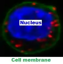 The DNA synthesis reaction results in several-hundredfold amplification of the DNA circle. Next, fluorescent-labeled complementary oligonucleotide probes are added, and they bind to the amplified DNA (Figure 4). The resulting high concentration of fluorescence is easily visible as a distinct bright spot when viewed with a fluorescence microscope.[4] In the specific case shown (Figure 5), the nucleus is enlarged because this is a B-cell lymphoma cell. The two proteins of interest are a B cell receptor and MYD88. The finding of interaction in the cytoplasm was interesting because B cell receptors are thought of as being located in the cell membrane.[5]