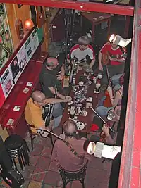 A pub session (seisiún in Irish; seisean in Scottish Gaelic; seshoon in Manx Gaelic) is performing music in the setting of a local pub, in which the music-making is intermingled with the consumption of ale, stout, and beer and conversation.[1] Performers sing and play traditional songs and tunes[1] from the Irish, English, Scottish and Manx traditions, using instruments such as the fiddle, accordion, concertina, flute, tin whistle, uilleann pipes, tenor banjo, guitar, and bodhrán.[2] Some sessions have dancing too.[3][4]