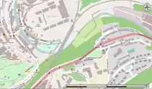 The viaduct crosses the Alzette valley between the north exit of the Luxembourg station and the Rham Plateau. The viaduct has two abutments and four intermediate supports of hollow reinforced concrete, supported by deep foundations of hollow reinforced concrete with a bridge deck formed of a composite structure made of a metal frame and a triangular tubular reinforced concrete slab.[1]