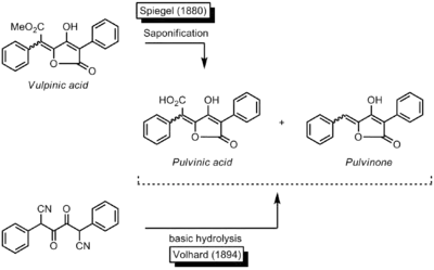 Synthesis of pulvinone from vulpinic acid (Spiegel,[6] top) and from a corresponding dicyanide (Volhard,[7] below)