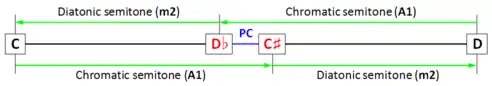 - Difference between two enharmonically equivalent notes in a Pythagorean scale, such as C and B♯, or D♭ and C♯ (see below).