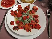 The meat, which has a strong flavor, can be eaten raw or cooked. Its taste has been described as like that of iodine[9] or "something like a sea urchin though less delicate in flavor" and a "slightly bitter, soapy taste".[10] It is usually cut into small pieces, and flavored with chopped onion, cilantro, and lemon. Minced and boiled, it serves as an element of many dishes, particularly arroz con piure picado, or "rice with minced piure". It can also be fried and eaten on bread. A similar edible tunicate in the Mediterranean is Microcosmus sabatieri, also called a sea violet or sea fig.[11]