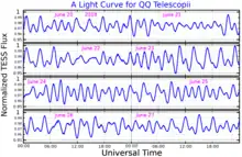 HD 185139 was discovered to be a δ Scuti variable in 1982 by Debora W. Kurtz along with HR 151 (BG Ceti).[18] After a few years of subsequent observations, it was given the variable designation QQ Telescopii in 1985.[19] In 2002, C. Koen and colleagues attempted to identify the pulsation modes of the star.[13] The brightness of QQ Tel fluctuates by about 0.05 magnitudes in the blue passband within 1.56 hours.[5]